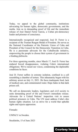El Consejo para la Transición Democrática en Cuba (CTDC) llamó esta semana a la comunidad internacional a unirse en la exigencia de fe de vida y la liberación inmediata del preso político y líder de la Unión Patriótica de Cuba (UNPACU), José Daniel Ferrer, encarcelado en la prisión de Mar Verde, en Santiago de Cuba.